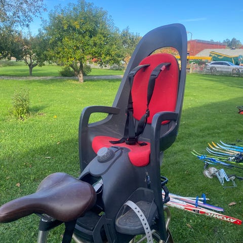 Hamax Kiss cykelsits i röd och svart färg. Cykelsitsen monteras bakom cykelns sadel och har ryggstöd, fotstöd med remmar samt säkerhetsbälte för barnet. Passar för transport av barn på cykel på kortare och längre turer. Sitsen är utformad för att ge stöd för rygg och ben under cykling.