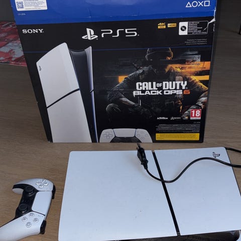 Säljer min PS5 Slim 1 TB i mycket fint skick. Köpt för cirka 1,5 år sedan, men har inte använts särskilt mycket, därför säljer jag den.