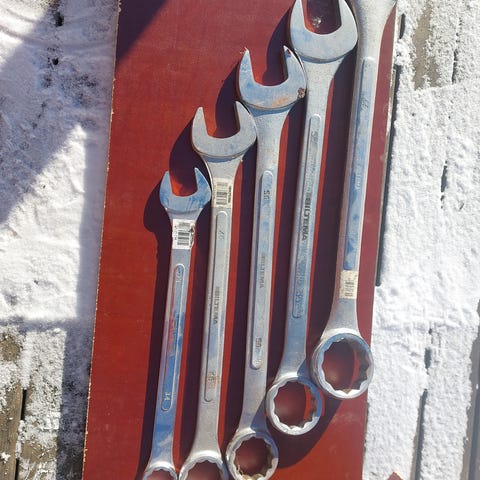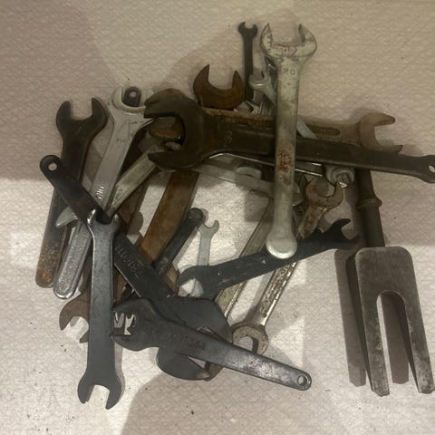 Blandat set fasta nycklar och en skiftnyckel i metall. Flera olika storlekar, både ringnycklar och öppna nycklar. Lämpliga för allmänt mek- och reparationsarbete där olika dimensioner behövs. Säljs som ett parti enligt bilderna.