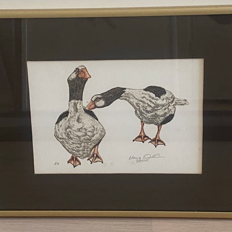 Tavla med akvarellmotiv föreställande två doppingar i vatten med vass. Verket är monterat med passepartout i en enkel guldfärgad ram. Lämplig som väggdekoration i till exempel vardagsrum, hall eller som del av en tavelvägg. Signatur finns i nedre vänstra hörnet.