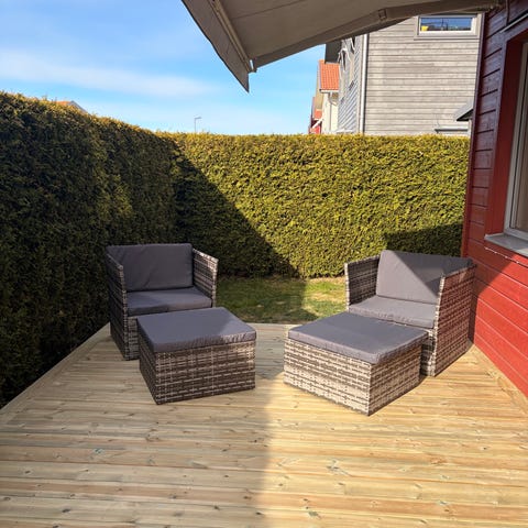 Fåtöljer i rottingliknande flätad plast med mörkgrå sitt- och ryggdynor. Stomme och ben i trä med metallförstärkning undertill. Öppen, hög rygg och generös sits som ger en avslappnad sittställning. Passar för inomhusbruk eller inglasad balkong/uteplats beroende på materialets tålighet mot väder enligt tillverkarens anvisningar.