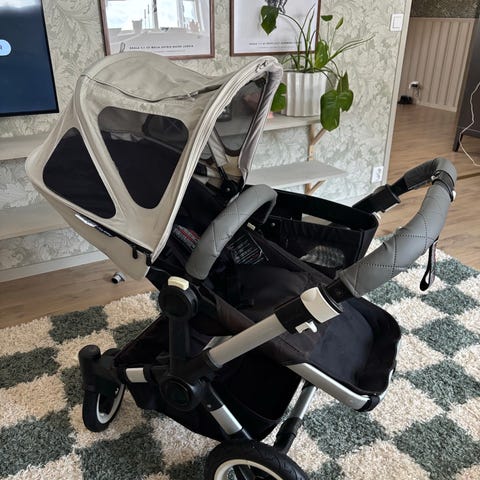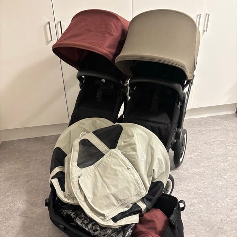 Säljer en syskonvagn med en liggdel och två sittdelar. Den är fullt fungerande men sliten.