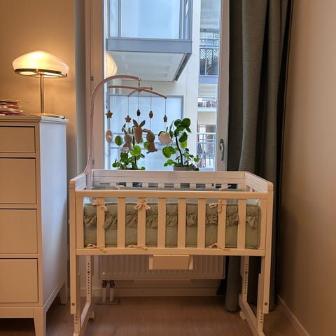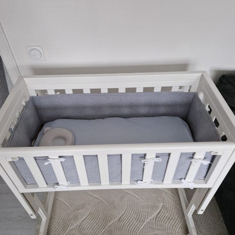 Troll bed side crib I utmärkt skick. Kommer med madrass, madrassskydd och spännen för att fästa fast i föräldrarnas säng.