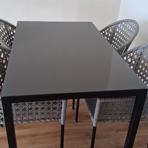 Tre glasskivor samt demonterbara ben i stål allt klätt med typ plastmaterial