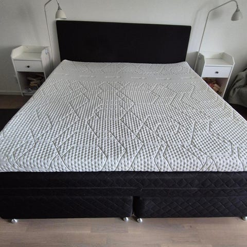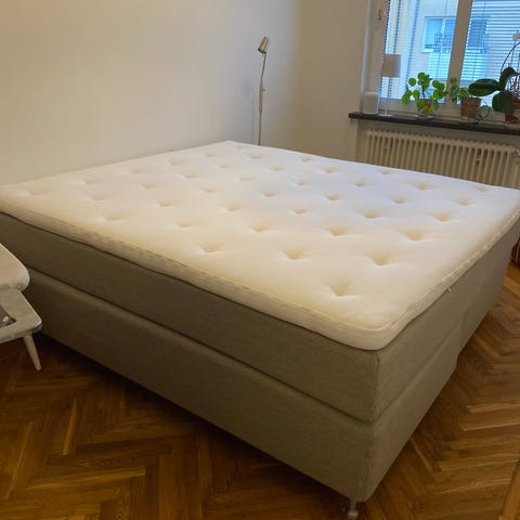 Mio kontinentalsäng i grå textilklädsel. Sängen har en hög, vadderad och knapptuftad gavel samt två underdelar med överliggande madrass. Neutralt grått tyg som passar i de flesta sovrumsmiljöer. Lämplig som dubbelsäng för två personer. Fast/Medium separata vändbara skummadrasser.
