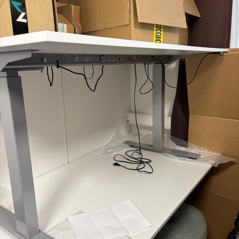 Skrivbordsskiva med integrerad el- och nätverksmodul. Skivan är rektangulär och har en utskuren öppning i mitten för elboxen, som innehåller flera eluttag och nätverks-/datauttag. Ytan är grön och avsedd för montering på separat underrede eller benställning. Passar som arbetsbord eller kontorsbord i kontorsmiljö eller hemmakontor där el- och nätverksanslutningar behövs lättåtkomligt i bordsskivan.