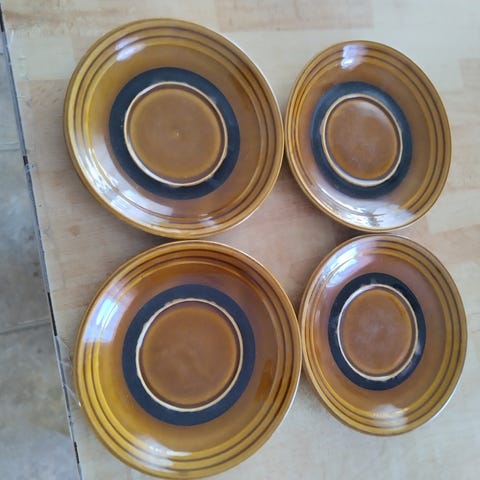 Rörstrad assietter i brunt porslin. Setet består av runda tallrikar med mörk kant och brun glasyr. Passar för servering