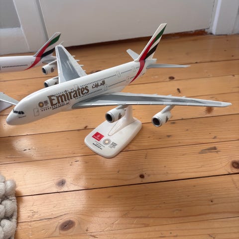 DHL modellflygplan i gul färg med röda logotyper. Planet står på en genomskinlig plastställning som ingår. Passar som prydnad eller samlarföremål för den som är intresserad av flyg eller logistikföretaget DHL.