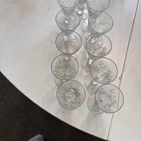11 stycken Set med mindre dessertskålar på fot i klarglas med slipad bladdekor. Skålarna är genomskinliga och lämpar sig för servering av dessert, förrätt eller andra mindre rätter. Klassisk form med rund fot och lätt utsvängd kant.Detta är ett vintageglas, troligen ett sherry- eller starkvinsglas, med en graverad eller slipad dekor föreställande bladverk och blommor.