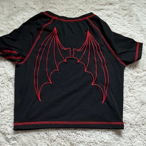 Långärmad topp för dam i storlek S. Svart linne i polyester med lång ärm och kort, något croppad passform. Framsidan har ett tryck i vitt med motiv. Passar som vardagsplagg eller till festligare tillfällen.