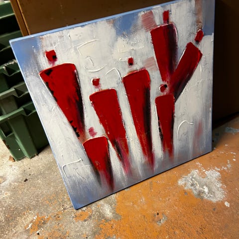 Tavla med abstrakt motiv i rött, svart och turkost. Verket är nyligen inramat med ljus träram och passepartout. Passar som väggdekoration i vardagsrum, sovrum eller arbetsrum.