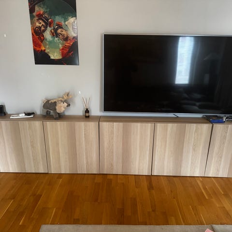 IKEA skåp med luckor, väggmonterat. Lång förvaringslösning med flera skåpssektioner och släta luckor i ljusgrå ton. Ovanpå skåpen finns en lång träskiva som fungerar som avställningsyta. Invändigt finns hyllplan som ger möjlighet till dold förvaring av till exempel elektronik, böcker eller annat hushållsgods. Passar bra som mediabänk eller förvaringsskåp i vardagsrum eller liknande utrymme.