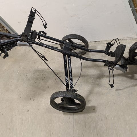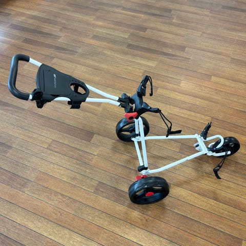 Golfvagn i svart färg med tre hjul. Stabil ram med handtag och hållare för golfbag. Fotbroms. Litet förvaringsfack och hållare för flaska. Utrustad med remmar för att fästa bagen. Vagnen är hopfällbar för enklare transport och förvaring. Passar för användning på golfbanan för att transportera golfbag och utrustning.
