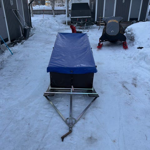 Kälke med en del år på nacken men knappt använd. Stått förvarad i uthus så lite smutsig på bild. Lådan går lätt att lyfta av. Ca 170x90cm lastyta. Medar i plåt men med plast under.