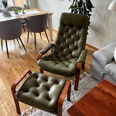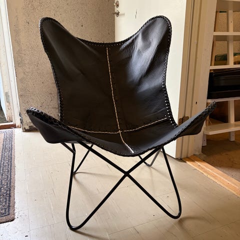 Fåtölj i så kallad butterfly‑modell med röd sits och rygg i konstläder. Stativ i svart metall med kryssformad underdel. Hål i konstlädret men annars fint skick.