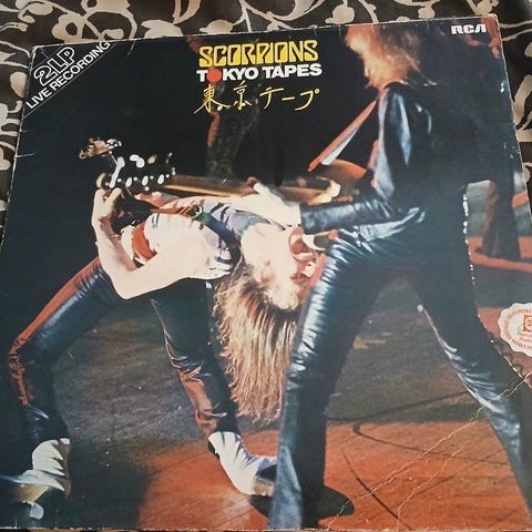 Scorpions Animal Magnetism vinylskiva. LP-skiva med originalomslag. Rockalbum med tryckt omslagsbild på framsida och baksida samt etikett på skivan. Lämplig för uppspelning på skivspelare som stödjer vinyl i LP-format.