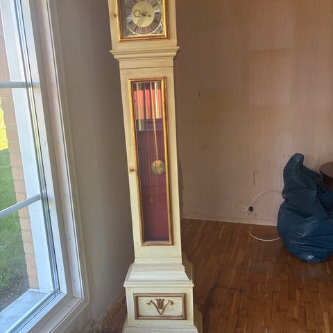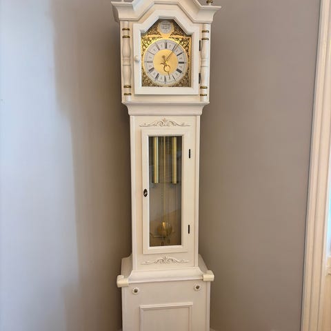 Golvur i trä (ek?). Urtavla med romerska siffror och två visare. Klockan går "ur takt", pendlar man igång den så går den lite för snabbt har jag för mig. Den slår en gång i timman.
