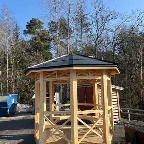 Fristående lusthus trädgårdspaviljong i trä för placering i trädgård. Byggnaden har vitmålade dörrar och fönster med glas runt om samt gulmålade ytterväggar. Taket är flersidigt och täckt med plåt eller liknande material. Invändigt är väggar och tak vitmålade och rummet rymmer exempelvis ett runt matbord med flera stolar. Paviljongen lämpar sig för umgänge, måltider eller avkoppling i trädgården och har flera fönster som ger bra ljusinsläpp.