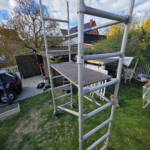 Lättvikts byggställning på hjul med förhöjningar och en plattform obs plattformen är lite för lång men den går att använda till ställningen