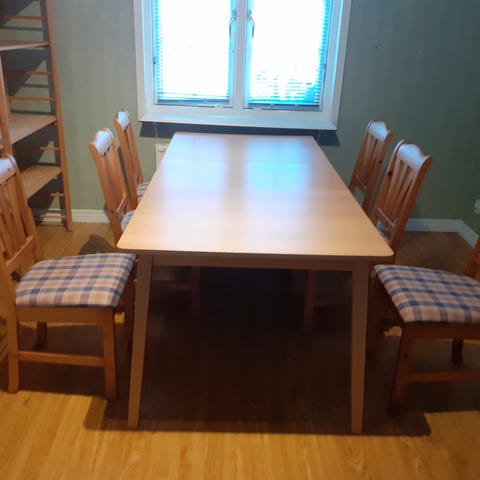 Matgrupp bestående av ett rektangulärt bord och två stolar i massiv ek. Bordsskivan har trälameller och raka ben. Stolarna har hög rygg och fotstöd. Passar som matplats eller barbordslösning i kök eller mindre utrymmen.