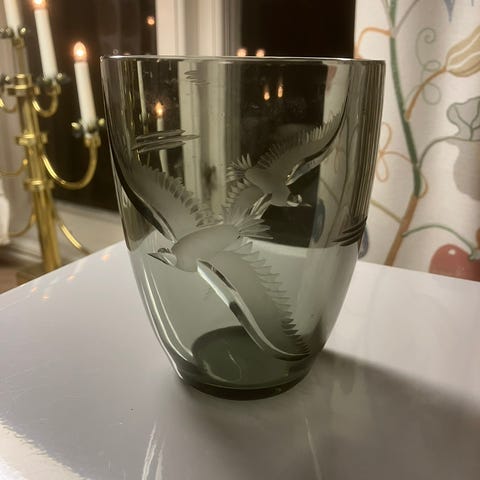 Ardy’s glas med målat fågelmotiv i guld- och bronsfärger samt guldfärgad kant upptill. Glaset är cirka 8 cm högt enligt måttbandet på bilden och har en rund form med något tjockare botten. Passar exempelvis som dricksglas, ljuslykta eller liten skål för mindre tillbehör.