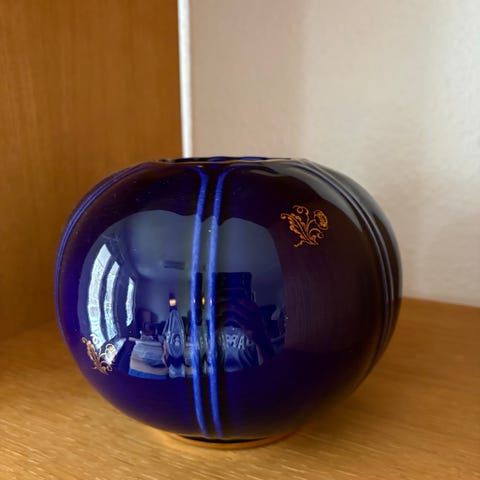 Ljuslykta i glas i droppform. Utsidan är blå med mönstrade inslag och insidan är vit med pärlemorskimrande effekt. Kanten runt öppningen är markerad i guldton. Ljuslyktan har en urfräsning för värmeljus eller mindre ljus i mitten. Passar som inredningsdetalj på bord, hylla eller fönsterbräda.