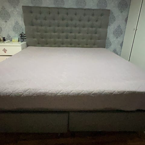Säng i beige tyg från Sova. Madrass ingår. Sänggaveln är rak med knappliknande dekorationer på framsidan från IKEA, beige. Sängramen är klädd i matchande beige tyg. Passar som dubbelsäng i sovrum.