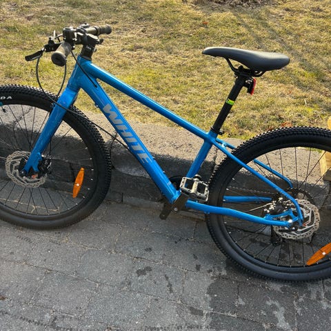 White barncykel med 24" hjul. Cykeln har turkos ram, raka styren och skivbromsar fram och bak. Utrustad med växlar bak, reflexer på hjulen och standardpedaler. Passar barn som behöver en något större cykel för vardagscykling och fritidsbruk på blandat underlag. Alltid stått i garage och är runt 3 år gammal må jag tro.
