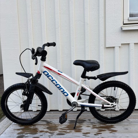 White AR 160 barncykel med 16" hjul. Cykeln är blå med gröna detaljer, utrustad med skärmar, kedjeskydd, reflexer och fotbroms. Lämplig som första trampcykel för barn som vuxit ur balanscykel, för cykling på gård, cykelväg och kortare turer. Synligt använd men funkar jättebra för en ny cyklist! :)