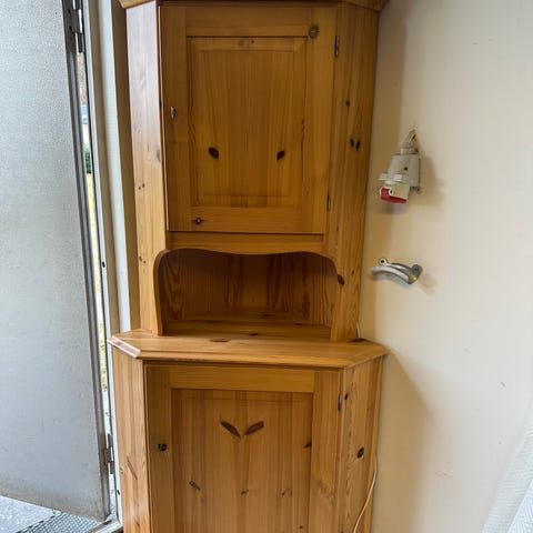 Tv-bänk i massiv furu. Möbeln består av en låg tv-del med öppna hyllor och flera lådor samt en högre del med glasdörr och öppna hyllplan. Passar för förvaring av tv, mediautrustning, böcker och prydnadssaker i vardagsrum eller liknande utrymme.