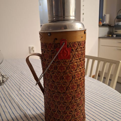 Termos TV-kanna retro i flätad plastrotting med skruvkork. Äldre. Finns vid Djursjukhuset i Bagarmossen. Skickas inte. 250 kronor
