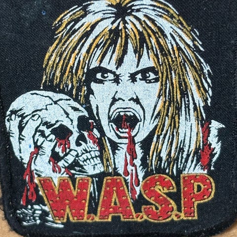 Accept patch tygmärke i svart med flerfärgat tryck av bandmotiv. Fyrkantig form med rundade hörn och kantad söm runt om. Passar för att sys eller fästas på exempelvis jacka, väska eller väst, 1980 tal.