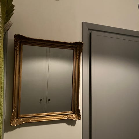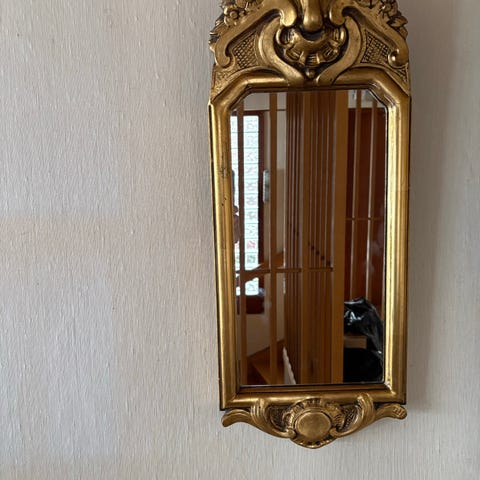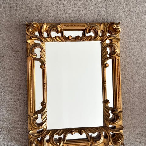 Mycket fin rektangulär spegel med dekorativt utsirad ram i guld från Oscar & Clothilde. Passar för upphängning på vägg i exempelvis hall, sovrum eller vardagsrum eller stående på byrå eller liknande. Mått H 71x B 46x D 3 cm.