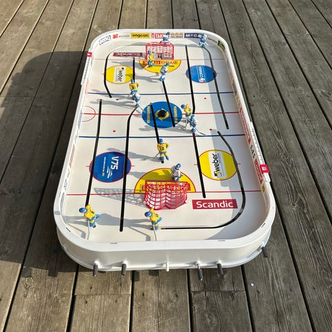 Stiga Play Off ishockeyspel med spelplan i plast och spelare monterade på stänger. Spelet föreställer en ishockeyrink med målburar, linjer och markeringar. Passar för två spelare och kan användas inomhus på bord eller golv. Spelarna styrs med reglage på sidorna av spelet för passningar och skott mot mål.