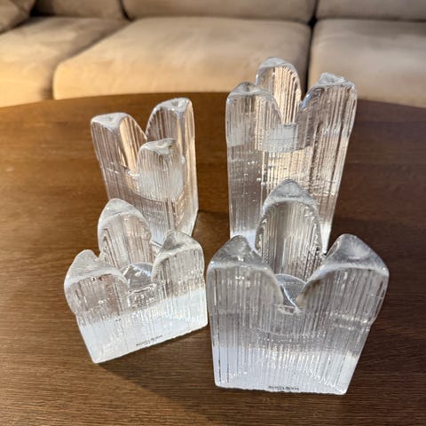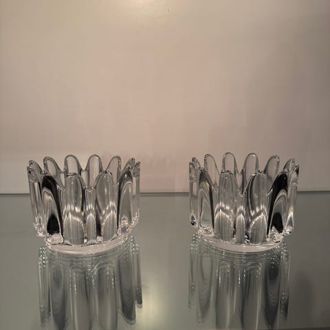 2sr Nybro Vulcano/Iceberg ljuslyktor i klart glas. Ljuslyktan har ett skulpturalt, isliknande mönster runt om och en nedsänkt hållare för värmeljus eller mindre ljus i mitten. Passar som dekoration på bord, hylla eller i vitrinskåp. Säljes som set enligt bilderna om inget annat anges i annonsen.