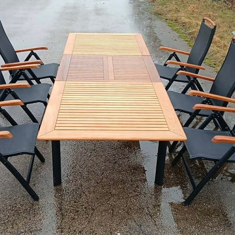Trädgårdsmöbel i teak för uteplats eller altan bestående av ett rektangulärt matbord och 6st positionsstolar med armstöd som har 7st inställningspositioner.