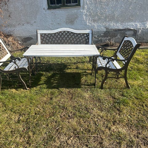 Bordet har måtten 235cmx80cm och är 80cm högt. Stolarna är fällbara positionsstolar med ribbad lite högre rygg och sits. De mörkgrå sittdynorna på bilden är nya och medföljer. Passar som trädgårdsmöbler eller utemöbler för större sällskap vid måltider och samvaro utom eller inomhus.
