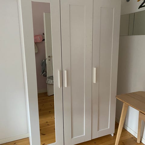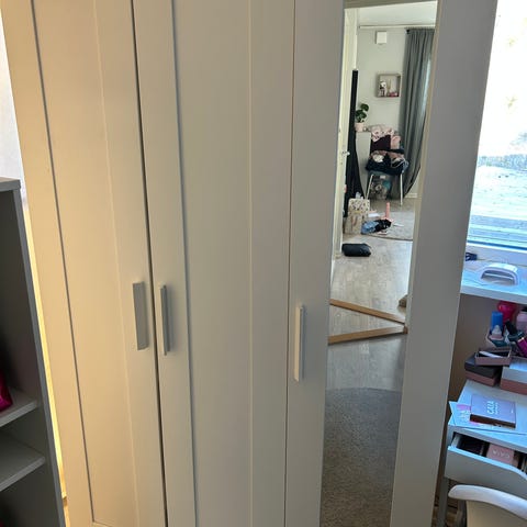 Säljer en vit IKEA Brimnes garderob med tre dörrar och spegel på grund av flytt. Garderoben är rymlig och fullt fungerande på insidan. Den är inredd med en klädstång på ena sidan och flera hyllplan på den andra, vilket ger bra förvaringsmöjligheter för både hängande och vikta kläder.