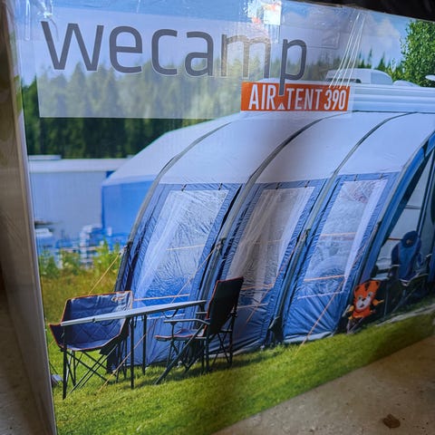 Nytt wecamp lufttält, passar till husvagn eller husbil, endast uppsatt för att fotografera, 280×240 cm. Vår bil är för hög för att den ska passa. Monteringshöjd 2,40-2,55 m. 3500 kr