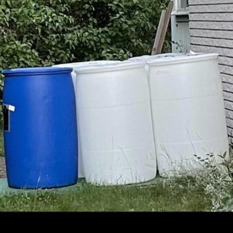 Plasttunor på cirka 200 liter i blå och vit färg. Faten har skruvlock/öppningar i locket för påfyllning och tömning.