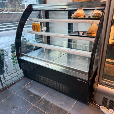 Gelato disken är utformad för servering av gelato i kantiner under glaslock. Modellen har rak glasfront och sidoglas som ger god insyn till produkterna. Yttermaterialet är i huvudsak vitt med mörk sockel. Avsedd för användning i exempelvis café, kiosk eller glassbar där glass ska förvaras fryst och samtidigt visas upp för kunder. Exakta mått, volym och effekt framgår av tillverkarens specifikationer för modellen Isa Delta.