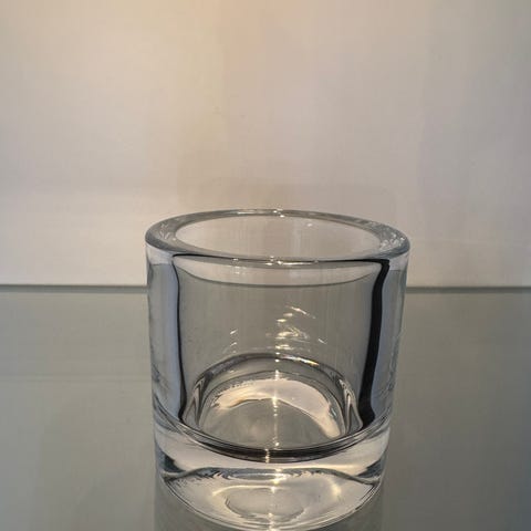 Rund ljuslykta i klart glas. Ljusstaken är avsedd för ett blockljus eller ett större kronljus. Öppningen upptill är skålad för att hålla ljuset stadigt på plats. Passar för användning på bord, hylla eller fönsterbräda som dekorativ ljushållare i hemmet.