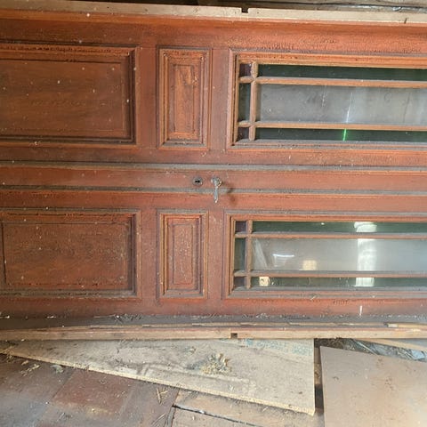 Två helglasade dörrar med tillhörande karm.