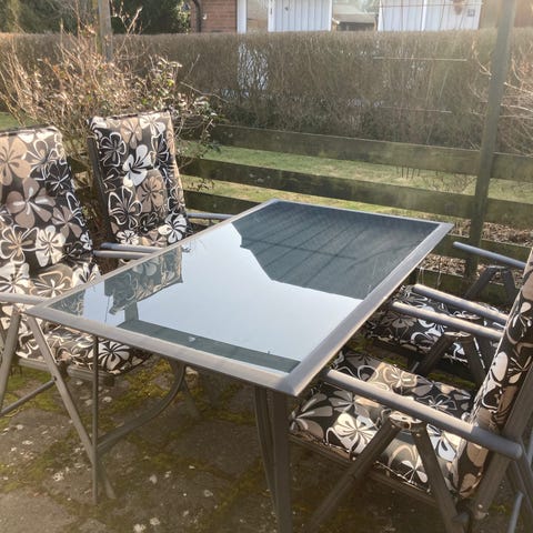 Loungeset med utemöbler i svart konstrotting. Setet består av 2 soffor 2sits och 3 sits, 1fåtölj och ett rektangulärt bord med glasskiva. Dynor och ryggkuddar i grå textil ingår. Dynorna är solblekta men sköna att sitta i.