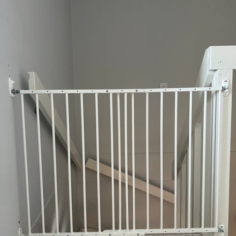 BabyDan säkerhetsgrind i vit metall för montering i dörröppning eller mellan rum. Grindens konstruktion består av lodräta spjälor och en öppningsbar sektion med handtag upptill. Avsedd för att hindra små barn från att nå vissa områden i hemmet, till exempel trappor eller specifika rum. Passar inomhusbruk och kan justeras inom ett visst måttspann beroende på dörr- eller gångöppningens bredd, enligt tillverkarens anvisningar. Monteras mellan väggar eller karmar med medföljande fästen enligt instruktion.