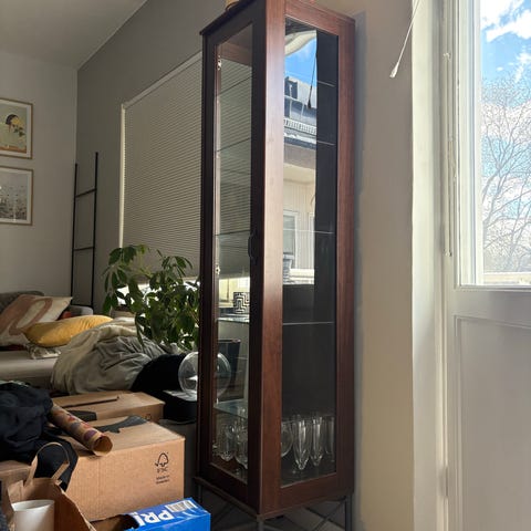Vitrinskåp i mörkt trä med tillhörande belysning.
