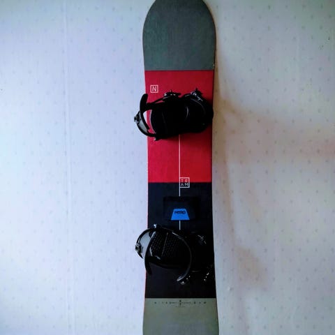 En All Mountain-bräda som är använd till just det: pist, lössnö och park. Funkar till allt. Varsamt använd till framförallt lössnöåkning.