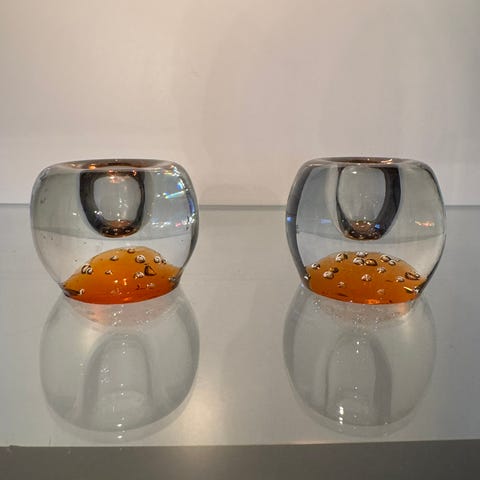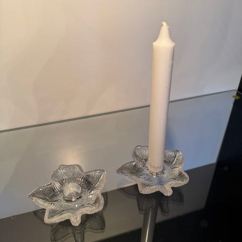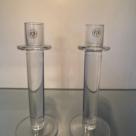 5st ljusstakar i klart glas. Cylindrisk fot och rak, hög ljushållare som passar för smala kronljus eller liknande ljus. Säljes som set enligt bilderna och lämpar sig för placering på bord, hylla eller fönsterbräda.