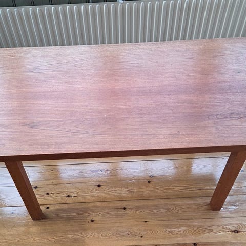 Rektangulärt soffbord i trä med bordsskiva i teak och ljusare ek kantlist. Bordet har rundade hörn och avsmalnande ben i trä. Underredet har en hylla för till exempel tidningar eller böcker. Passar som soffbord i vardagsrum.