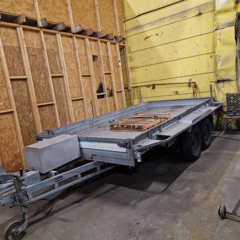 K Vagnen 1600 Kg. 2000 Kg. Tot. Med kardandriven löv sug med tillhörande grindar, slang och presenning, Hög, sido och bak tipp. 2 uppsättningar hjul och div. Delar till drag